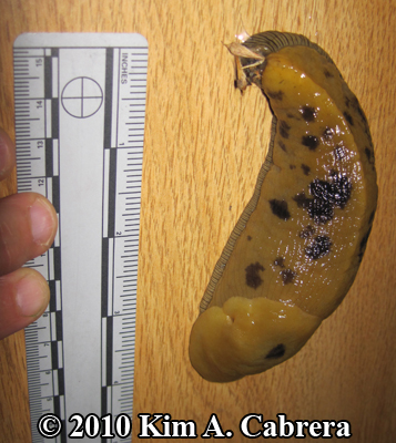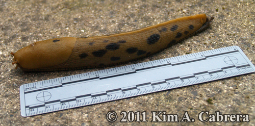 This banana slug is the spotted variety. They are the same species, but the coloration can vary from plain bright yellow, to a spotted appearance like this. This slug is not stretched out full length. |