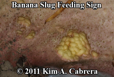 A banana slug with its scat. Banana slug scat is one of the most common signs you will find that indicate the presence of this critter.The scat is expelled from the hole on the side of the slug's "head." The hole is located on the right side of the head. |