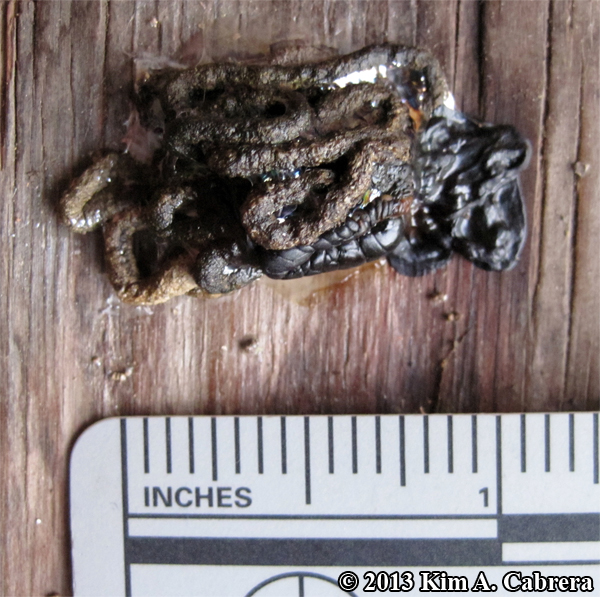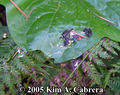 Close-up of banana slug scat. Their scats may be deposited on walls, the ground, leaves, tree bark, and many other locations. Just about anywhere you find the slugs!) The other commonly seen sign is the slime trail. Slugs leave a continuous line of slime, unlike snails, which leave discontinuous spots of slime. |