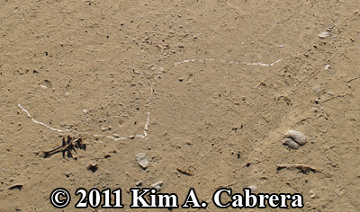 | A banana slug slime trail across a dirt road shows up well in afternoon sunlight when viewed at the right angle. |