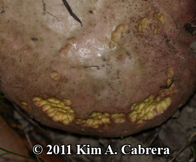 Here is a close-up showing the feeding sign of a banana slug on a mushroom. The scalloped appearance is typical of their feeding sign. |