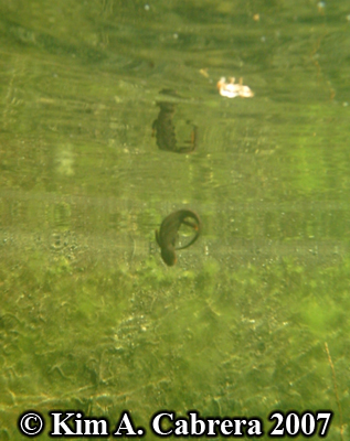 These two rough-skinned newts were underwater in the Eel River. They were at a depth of about 12 feet. During the summer, there was a group of newts that lived in this location. They lived among the algae on the river bottom. Periodically, they would swim the the surface, then dive back down. |
