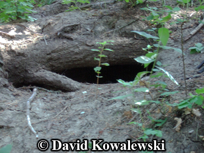 An active wolf den. The vegetation damage at the entrance is fresh, indicating recent use. |