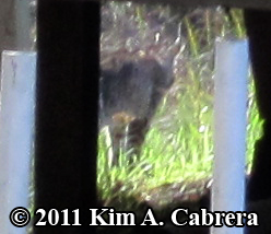 This bobcat came up to the deck one day when I was sitting there quietly reading a book. My cat, Boots, was lying there next to me, taking a nap. The bobcat growled at him and my cat ran behind me to hide. I stood between them for about ten minutes as the bobcat postured and growled. It would not approach when I was there. But it wanted to. My cat wisely chose to stay put. After about ten minutes, the bobcat walked slowly away, stiff-legged. I grabbed Boots and took him inside. I grabbed the camera and went back out. The only photo I got of the bobcat was this view of it as it walked away. This was taken looking through the deck supports, so it's not the best photo. Sure wish I had the camera in hand when it was so close to me! |