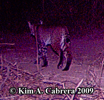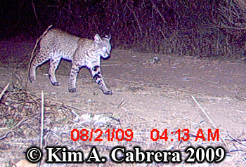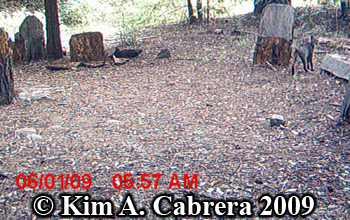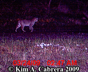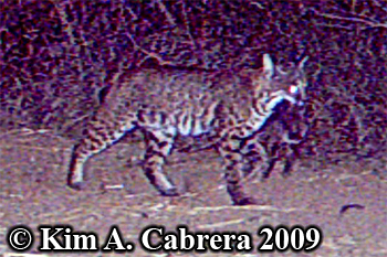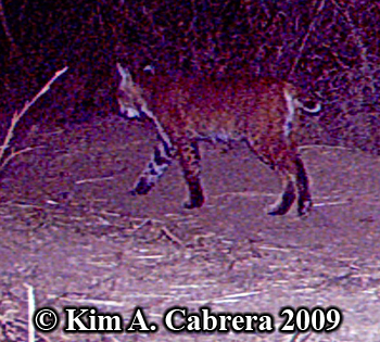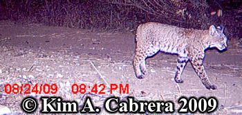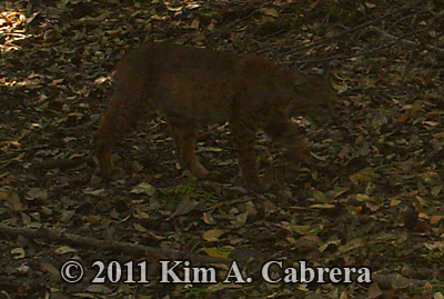 This photo was taken on my remote trail camera the day before I saw the bobcat in the photos above it. The trail camera was located in a forest near a river, in an area below the field where I saw the bobcat above. I am not sure it is the same bobcat, but it is very likely that it is. I set the trail camera up in this location because I have found bobcat tracks in the area frequently. There is also a mountain lion that passes through this way about every 90 days or so. I regularly find his tracks, and his trail crosses this trail right about here. I hoped to get a photo of the cougar on the trail. So far, I've gotten the bobcat, coyotes, deer, squirrels, skunks, gray fox, and people, but no cougar. Yet... |