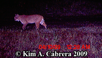 This bobcat was caught on the trail camera as it paused to look over the field below. The day was a bright sunny spring day. You can see the two white spots on the backs of the ears, which is a characteristic of bobcats. Bobcats often pause like this while they are hidden in cover to look for prey or other movement. They prefer edge habitat because it offers them this cover while also allowing them to see out. |