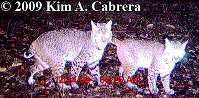 The flash nearly washed out this photo of a mama bobcat and her cub. |