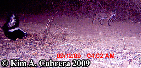 The bobcat is walking past the skunk, carrying a rabbit in its mouth. The skunk seems very unperturbed by the presence of the bobcat. Maybe the skunk realizes the bobcat has prey, or the skunk knows it is able to defend itself against a bobcat. I would bet on the second option. |