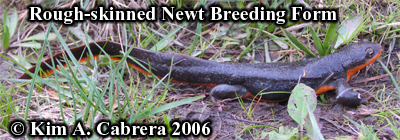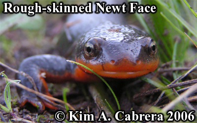 Rough-skinned newts are one of the most aquatic of newts. They live in rivers, streams, ponds, and other watercourses. These newts are poisonous if eaten. If you find one and are tempted to pick it up, handle it carefully and wash your hands thoroughly afterward. When handling amphibians, make sure your hands are not coated with insect repellent or lotions. Wet your hands before handling amphibians. |
