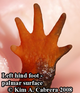 This is the bottom of the left hind foot. It is the palm, or palmar surface of the foot. The hind feet have five toes. |