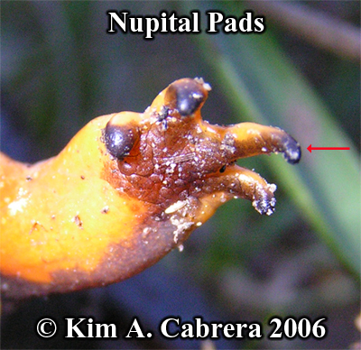 The nuptial pads are found on male newts in breeding form. During this time, their skin is smooth. They also have these nuptial pads that probably serve to help them grip the female newt during mating. Male newts grip the female from behind in a position known as amplexus. These pads are not found on the female newt. |