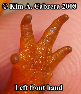 The left front foot of a rough-skinned newt. The front feet both have four toes. Newts have no claws. During the breeding season, male newts have "nuptial pads" on the tips of their fingers. Photo below. |