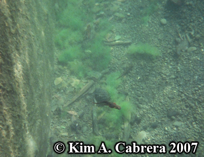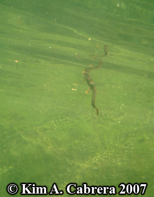 These two rough-skinned newts were underwater in the Eel River. They were at a depth of about 12 feet. During the summer, there was a group of newts that lived in this location. They lived among the algae on the river bottom. Periodically, they would swim the the surface, then dive back down. |