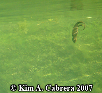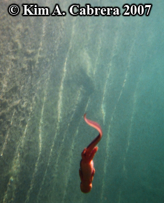 Sometimes, the newts would swim partway up to the surface, then float like this. It looked like they were taking a break from swimming. After a break, some of them would float all the way back to the river bed. Others would resume swimming to the surface. |
