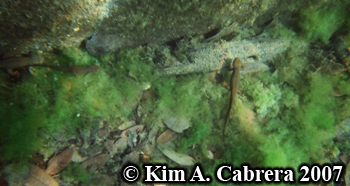 Another newt resting on the river bottom. The algae provided protection from predators and possibly a place to find food. The only predator known to eat them and survive is the common garter snake. |