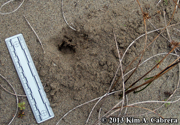A nice left front striped skunk track in firm sand. This one barely shows an imprint from the foot. It is mostly claw marks. |