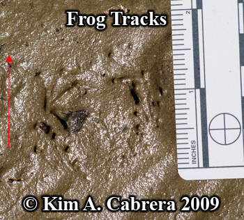 This photo shows the hopping tracks of a treefrog in silty mud. This type of soil is ideal for showing the details of the tracks of small, lightweight animals like frogs and mice. | |