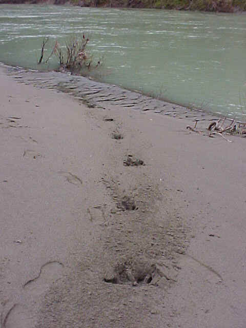 These two pig track pictures illustrate track aging. The first picture is a fresh pig track. I took this picture no more than five minutes after the pig left it. The picture on the right is the same track after 38 days. In that time, there had been rain, freezing temperatures, and even snow that stayed on the ground for six days. Even after all that, it is still recognizable as a pig track. This track lasted until the river level came up in a big rainstorm about a week after I took this picture. It would probably still be visible if it hadn't been washed away by high water.
